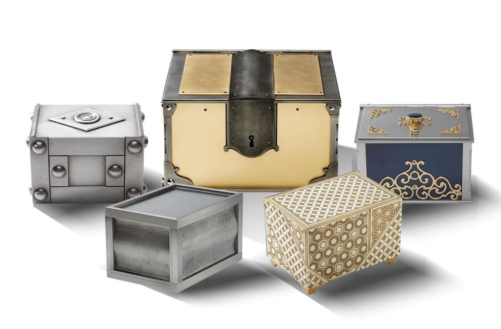 Each treasure box is custom designed, one-of-a-kind, and forged of metals. The creation of these treasure boxes took more than a year. Each treasure box is also a puzzle box, meaning each box requires a set of movements to open it. Instructions have been left with each box detailing how to unlock it.